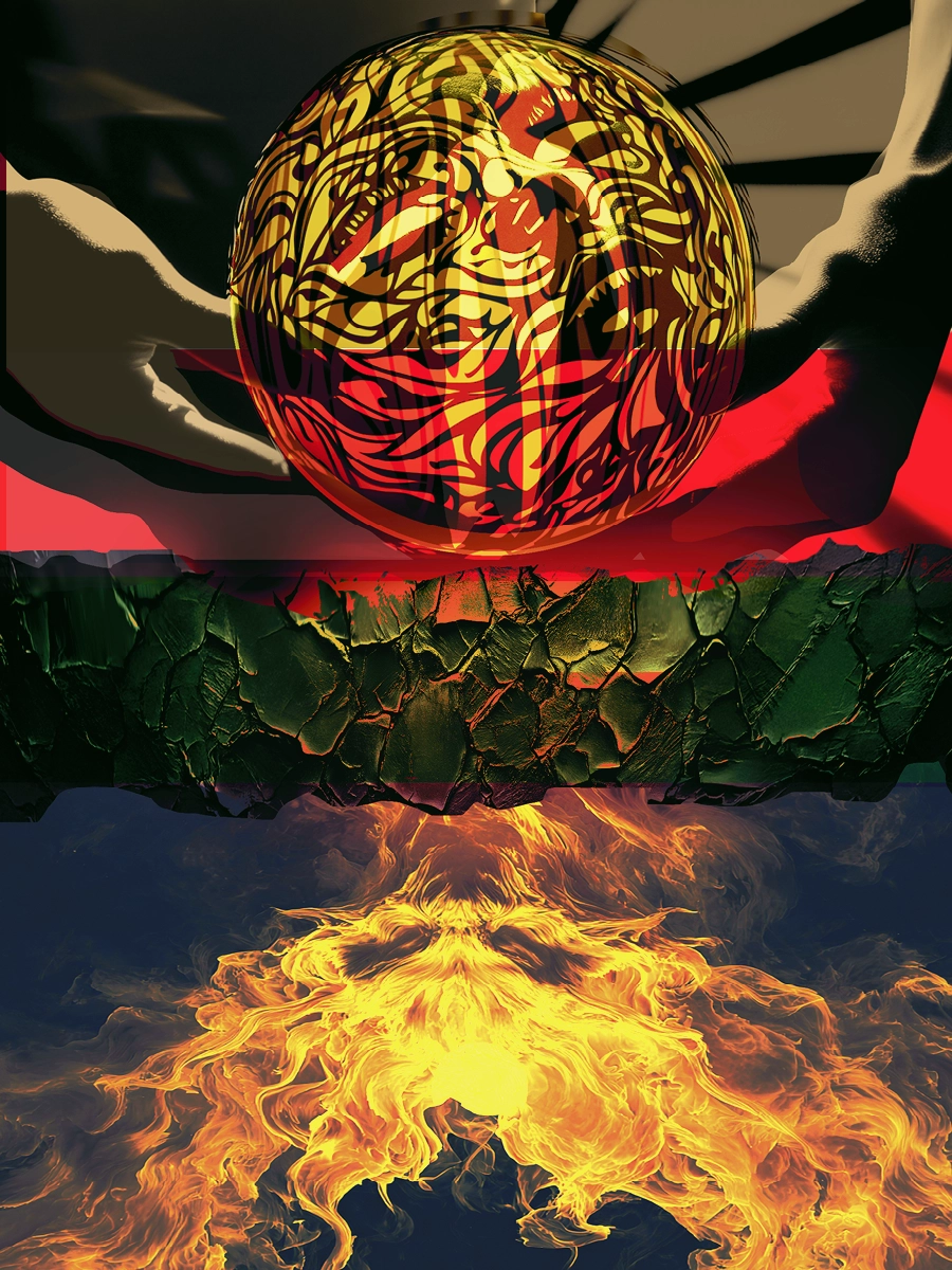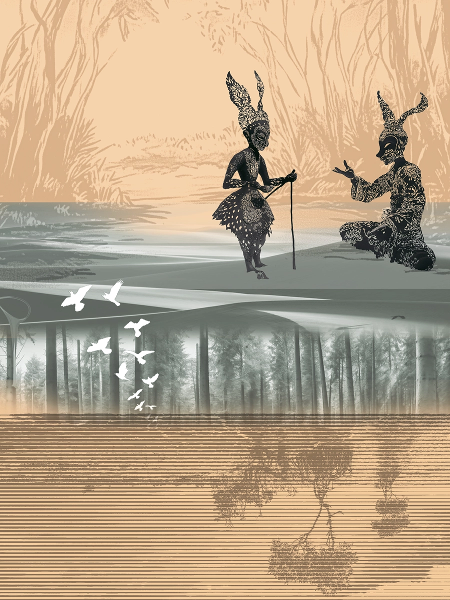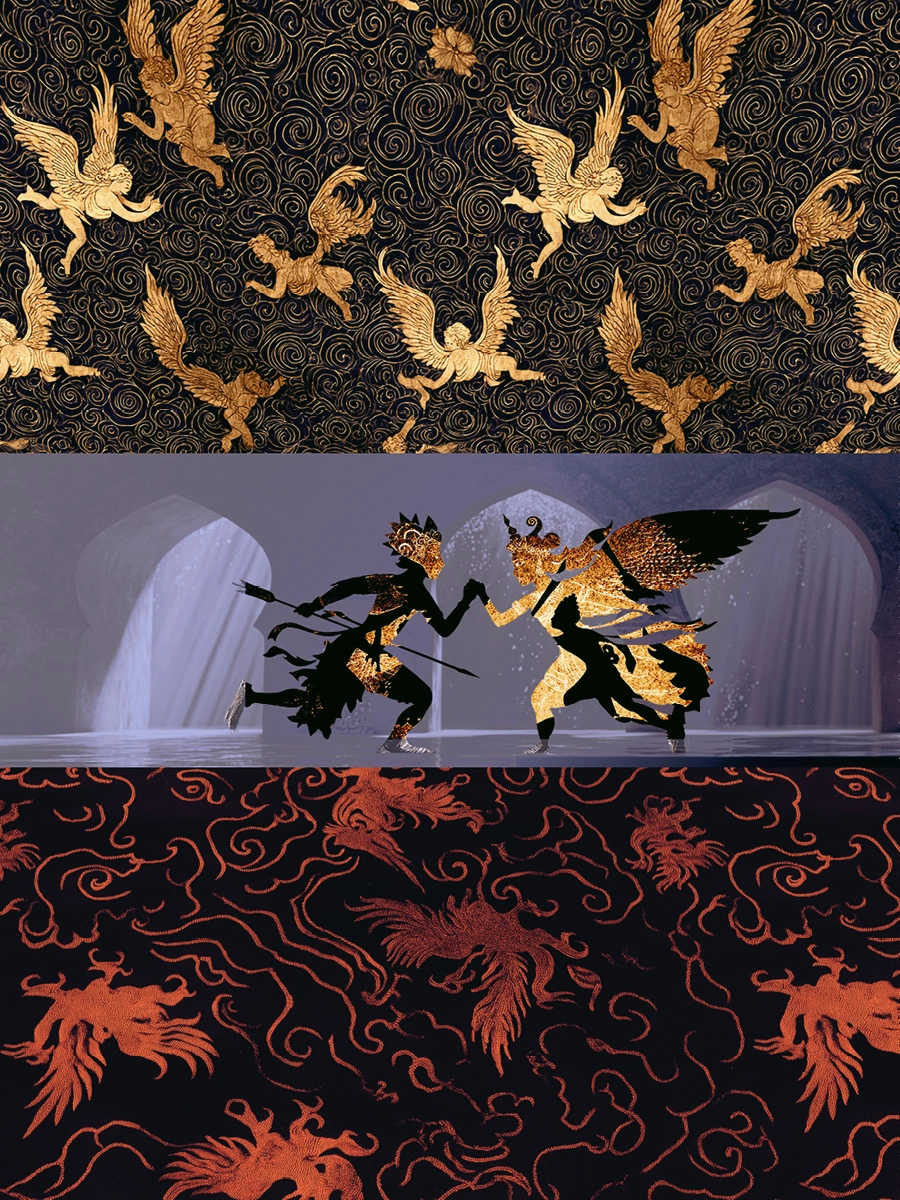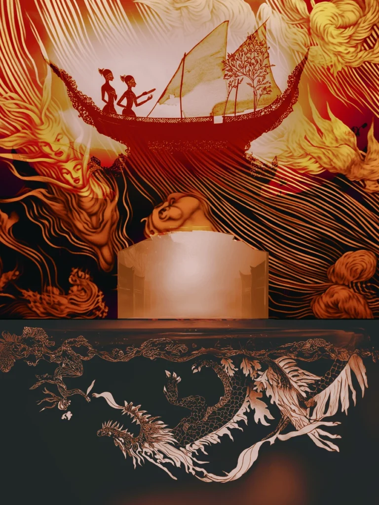 Fragments of an Unspoken Epic Poem is a series of 24 satirical paintings based on an imagined Eastern epic poem that unfolds as disjunctive cantos and brought to life in a fictional and historical art exhibit. Blending humor with reverence, each painting is structured in three vertical realms: Heaven, Earth, and the Underworld. Rooted in Eastern cosmologies, this triadic form reflects cycles of life, death, and rebirth. Here, the underworld is imagined as not only a place of suffering, but also one of wisdom, transformation, and moral ambiguity. A dark reflection of the celestial sphere, the underworld emerges as a distorted symmetrical mirror of heaven, where light and shadow blur the boundaries between perceived good and evil, challenging conventional notions of morality.