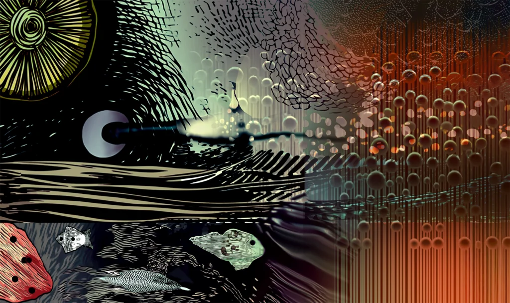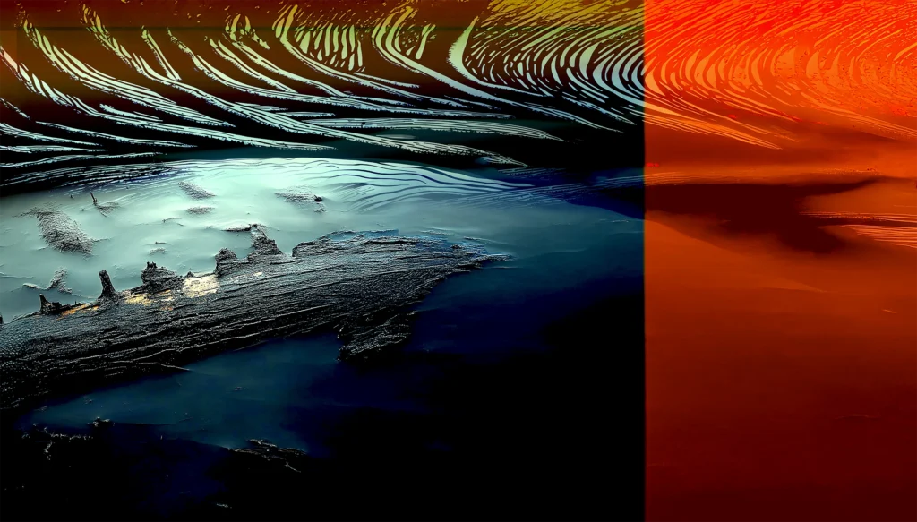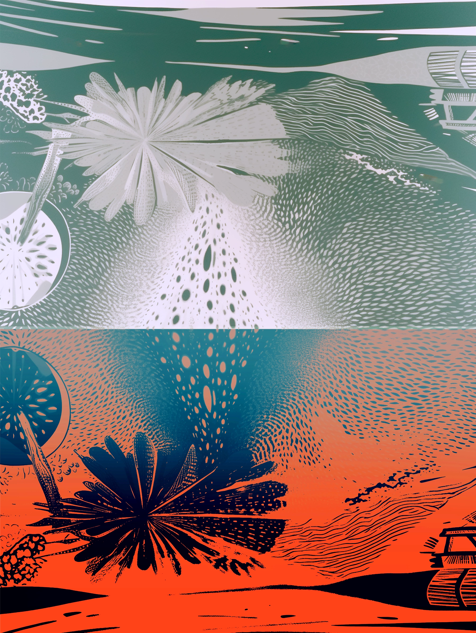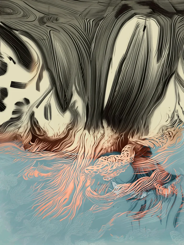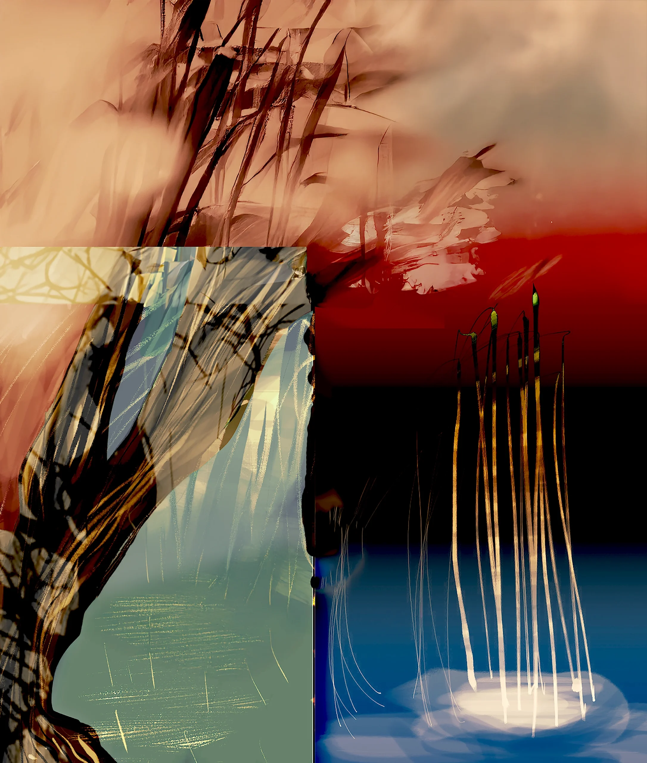 These paintings, organized as thematic exhibitions, begin as computational image constructs, developed through the fusion of Sumi ink drawings, photographs, and generative source material using intelligent photo-compositing. They are developed for realization as unique archival pigment paintings on Belgian linen, each with an embedded RFID identifier for authentication and provenance.